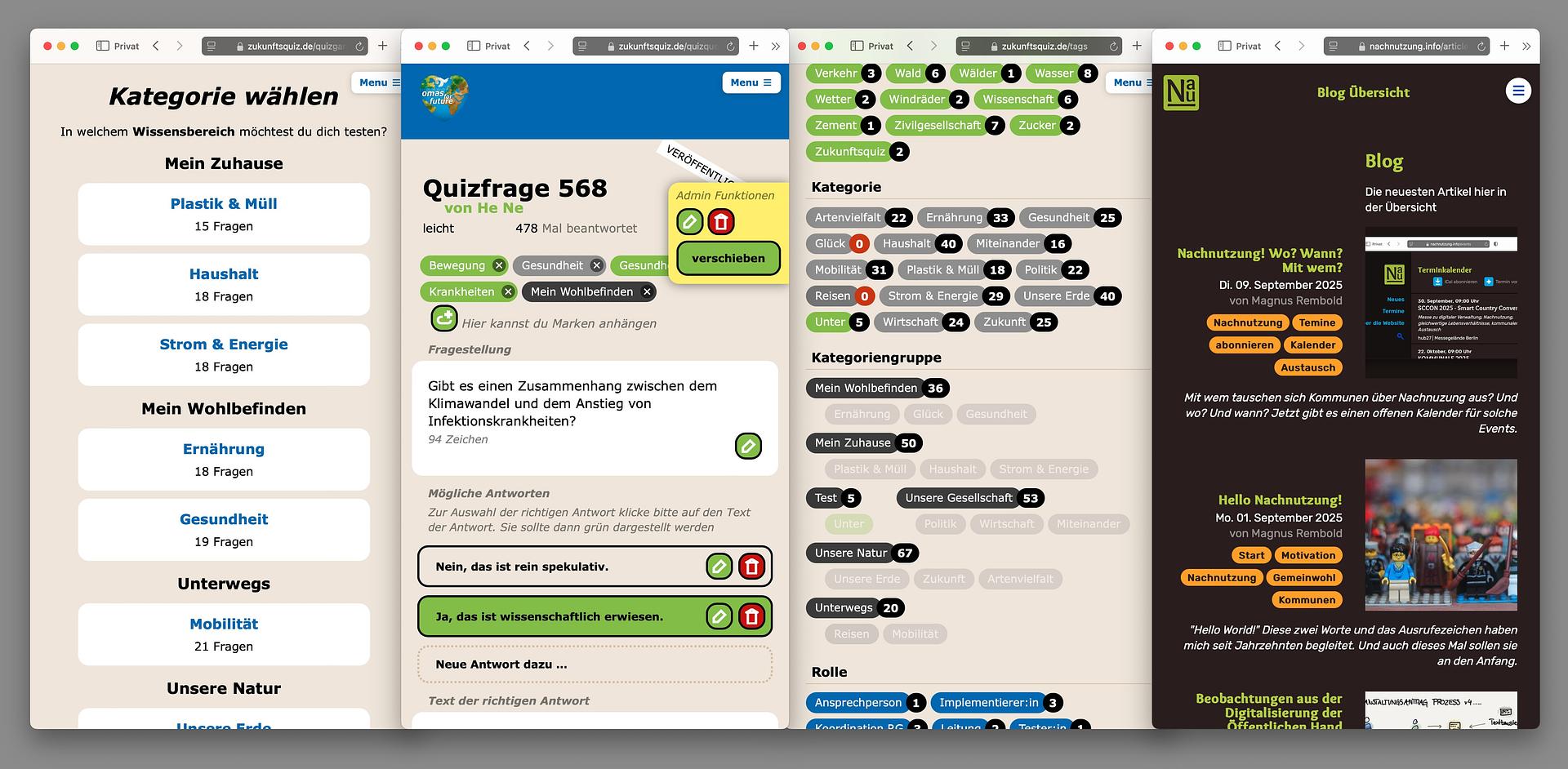 Für ihr Redaktionssystem in dem sie inzwischen weit über 200 Fragen zu Klimakrise, Gesundheit, Zukunft und mehr verwalten, brauchte es eine Möglichkeit, die Quizfragen zu kategorisieren. Die Omas wollten, dass man am Beginn des Zukunftsquiz auswählen kann, aus welchem Bereich man sich testen möchte (siehe erstes Bildschirmfoto weiter unten).